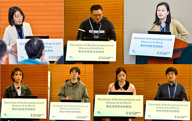 山东大学博士研究生刘朵分析了碱性溶液中铁片的腐蚀行为和氯离子对铁片腐蚀的影响,获得了脱盐过程溶液中氯离子浓度阈值。北京化工大学博士研究生吴玉清详细解读了ww 2018-014-t《铁质文物缓蚀材料要求》标准研制思路,通过收集标准化数据,建立缓蚀剂适用性、有效性及其长期性能数据库,为不同类型金属文物提供具有针对性的缓蚀策略。中国文化遗产研究院马菁毓研究馆员和北京化工大学贾梦秋教授制备了一种席夫碱缓蚀剂,通过与单宁酸进行复配,与二氧化硅包覆石墨烯复合材料制成复合涂层,实现铁质文物高效缓蚀。