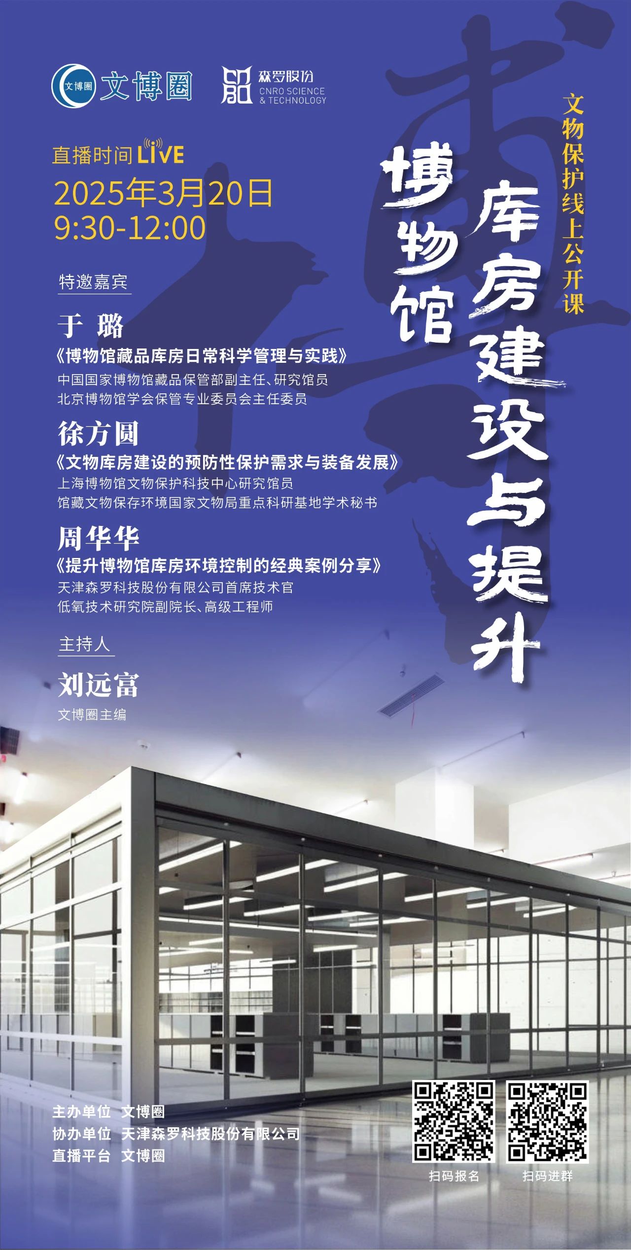 2025-03-17为进一步做好博物馆藏品保护工作,分享文物保护专业知识,由文博圈主办、天津森罗科技股份有限公司协办的“文物保护线上公开课”正式启动,公开课将围绕文物保护相关主题,邀请各领域专家带来系列线上直播分享,打造免费的文物保护线上公开课。